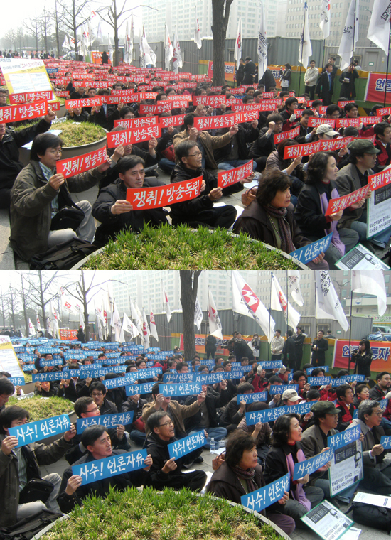 チェ・シジュン放送通信委員会委員長内定者に対する非適格是非が絶えず続い ているが、言論市民社会団体で構成された「報道機関宥和阻止およびメディア 公共性拡大のための社会行動(メディア行動)」と全国言論労働組合は、3月11日 に決意大会を開き、チェ・シジュン氏の内定を強行する李明博政権を圧迫し始 めた。 メディア行動、言論労組など500余人の労働者、活動家は、汝矣島国会前で言論 掌握阻止のための決意大会を開き、チェ・シジュン氏の内定撤回および放送通 信委員会設立法の即刻改正を要求した。 彼らは決議文で「李明博政権が言論掌握の陰謀を露骨に表わしている」とし 「国民3人のうち2人が、放送学者10人のうち7人が、またハンナラ党を除く政界 すべてが非適格だという理由でチェ・シジュン候補者に反対している」と主張した。 彼らは決議文でチェ・シジュン委員長の内定を権力が言論を掌握するための布 石だと説明し、「言論を鎖でしばろうとするすべての意図を即刻中断せよ」と 要求する一方、「そうでなければ国民的な抵抗を避けられない」という決意を 明らかにした。