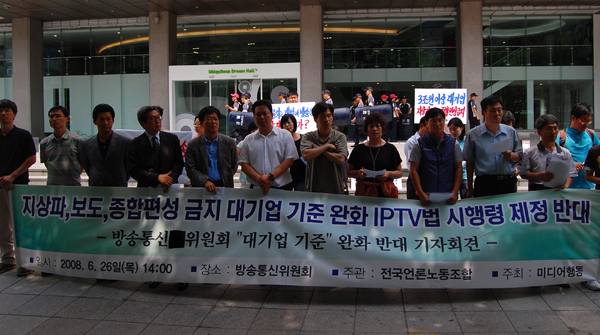 今日の記者会見の題名は『大企業に地上波、報道、総合編成を許すIPTV放送法 施行令制定に反対する』であった。 IPTV放送法施行令の内容がどの程度知られているのか、どれほど批判されてい るのかを推し量るのは難しい。ただし李明博政権のメディア掌握の試みに対し、 公営放送を守る市民の抵抗の規模から推し量れば、IPTV法施行令の議決が招く メディア地形の変化と、これが社会構成員の暮しに及ぼす影響の判断と対応の 緊張の程度は相対的に低いと思われる。 言わば、放送通信機構改編、チェ・シジュン氏の落下点、KBS理事会介入、YTN などの天下り人事などが、メディアへの政治的な掌握を直接の目標にするもの だとすれば、予告されるIPTV法施行令は財閥のメディア掌握の保障を直接の目 標とするものだ。前者は政治的で即刻の問題として膚で感じられるが、後者は 事実いくらかの時間が流れてから現実として認められるような性格を帯びている。 しかしメディアの当事者は、前者よりも後者がはるかに危険だと見ている。前 者は力でいくらでも戦う根拠があるが、後者はとにかく現実になれば戦いたく ても戦えない、そんな状況と遭遇するほかはないと本能的に感じているためだ。 それで今日の記者会見にはいつもの記者会見とは比較にならないメディア当事 者の当惑と危機感でいっぱいだった。 IPTV法施行令議決、3兆ウォンから10兆ウォンに 施行令は資本(財閥)がメディアを金で買えるようにしている。換言すれば政府 (放送通信委員会)が財閥にメディアを売り払う方案を合法化するということだ。 現行の放送法施行令は、資産規模3兆ウォン以上の資本(相互出資制限企業集団)は 報道および総合編成チャンネル事業ができないと規定している。これは、資本 がメディアを所有して介入する余地を制限することで、公共映像性、公共性を 維持する最低限の条件を意味する。放送通信委員会は、IPTV法施行令にこの基 準を資産規模10兆ウォン以上の資本に緩和する内容を入れた。放送通信委は、 資本の基準をこれまでの10兆ウォン以上ではなく、さらに20兆ウォンあるいは 30兆ウォン以上に緩和する方案も検討しているという。 4月の公正取引委員会発表によれば、資産総額3兆ウォン以上、10兆ウォン未満 の資本(相互出資制限企業集団)は、LS、東部、デリム、現代、大宇造船海洋、 KCC、GM大宇、現代建設、東国製鋼、ヒョソン、東洋、韓進重工業、大韓電線、 現代デパート、永豊、イーランド、コオロン、ウンジン、ハイトビール、浮栄、 セア、東洋化学、テグァン、サムスンテスコ、ミレアセットなどが含まれる。 資産規模10兆ウォンを越えるメディア界財閥CJも、一部の借金を清算すれば資 格が備わる。 メディア行動は今日の記者会見で「大企業基準の緩和は親政府与党放送局開局 のための放送通信委の術策」と規定し、「施行令の第7条2項の大企業規定は、 現行の放送法を準用し、資産規模3兆ウォン以上に維持しろ」と要求した。 メディア行動は、李明博政権が地上波放送の統制ができないことを知り、非協 調的な放送に代えて好みに合う世論形成と宣伝扇動に力のある放送の必要によ り、政府与党と親和的にならざるをえない資本に放送を与えるため、IPTB法の 施行令を推進すると指摘した。 財閥がメディアを所有すれば必ず問題になるのだろうか。答は「そうだ」だ。 既存の放送法が財閥の地上波、報道、総合編成チャンネルの所有を制限したり 兼営を認めないのは、財閥が放送を所有されれば世論の多様性の機能と視聴者 の権利を優先的に考慮するより、特定企業の利益を代弁し、世論と市場を歪曲 する可能性が高いと見たためだ。 メディアは、世論が形成され流通する公的空間だ。誰かの意図で世論形成と流 通に介入する瞬間、それも法制度の保証の中で資本の欲が貫徹される条件がで きた瞬間、世論の多様性と社会構成員の表現の自由の制約は不可避になる。空 気のような公器になるべく、メディアを金で較べないようにしなければならない。 メディア行動、資産規模変更の試みの経緯と根拠資料提示など3項目を要求 メディア行動は、放送通信委がIPTVの成功のために財閥の参加が必須だと言う 主張に対しても、盲点を指摘した。放送通信委はIPTVの報道と総合編成PP(番組 供給者)に資本が投入されなければコンテンツが活性化しないと強調するが、こ れはケーブル事業者の優越的な地位がIPTVに提供するコンテンツ事業者を縮小 させ、低い視聴料収益配分は群小PPを枯死寸前に追いやるという事実を無視し ていると批判する。 今日の記者会見でメディア行動は、放送通信委に、△資産規模3兆ウォンを10兆 ウォン以上に変更しようとした経緯と根拠資料の提示、△これを議論した該当の 実務部での意見と各放送委員の見解の公開、△現行放送法を準用して3兆ウォン 以上を維持するという3つの事項を要求した。 連続するキャンドル集会、多数国民の牛肉交渉反対、民営化反対の声にもかか わらず