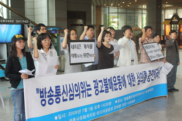 メディア行動は今日(7月1日)午後2時に予定された放送通信審議委員会全体会議 で広告不買運動の審議を中断することを要求した。 放送通信審議委が開かれる30分前、放送会館1階のロビーで持った記者会見で、 彼らは「放送通信審議委は自分の権限でもない広告不買運動に対する審議から 手を切れ」と要求し「ネチズンの掲示物に削除要求をする場合、違憲訴訟を提 起する」と主張した。