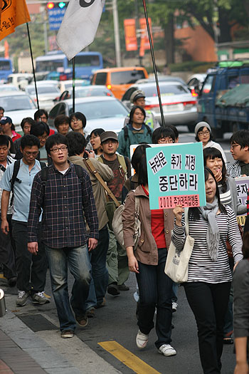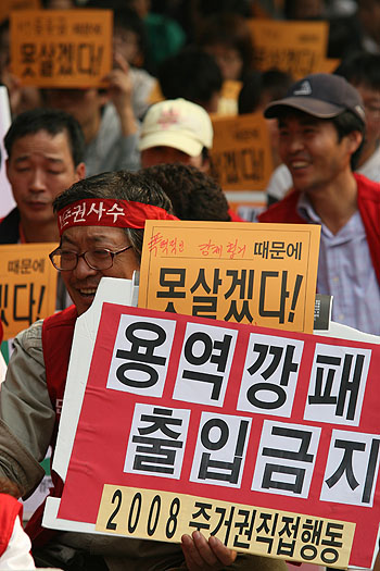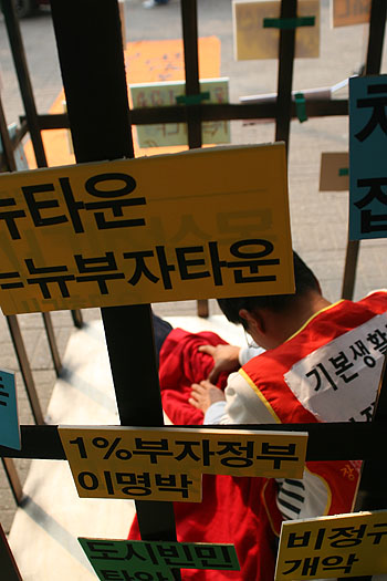 権利宣言大会の参加者は「貧困の深化で多くの庶民の暮らしが奈落に落ちた」 「しかし李明博政権はこれを無視し、金持ちのための減税、開発政策を進め、 福祉予算削減などを改悪し、国民の経済的疲労をさらに重くした」と指摘した。 彼らは続いて「労働者には低賃金非正規職を、住居貧困層には開発を理由とす る強制退去を、貧しい人々には物価暴騰と公共料金値上げをプレゼントする人々 は、持てる者たちには税金減免、規制緩和、公企業私有化をプレゼントする」 と付け加えた。
