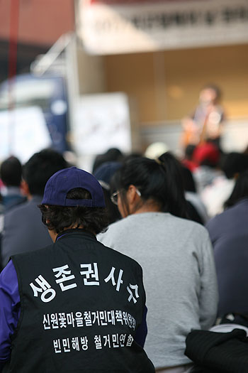 10月17日、国連の「世界貧困撤廃デー」をむかえ、貧民当事者がソウル市の 大学路マロニエ公園で「1017貧困撤廃デー権利宣言大会(権利宣言大会)」を開いた。 この日の権利宣言大会には、ビニールハウス村の住民、露天商、撤去民、 野宿者と社会団体会員など400人ほどが参加した。