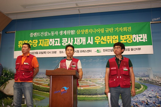 サムスン精密化学工場で起きた水タンクの爆発事故により、該当現場で働いたプラント労働者は仕事が出来なくなり、休業手当てを要求している。 ![]() ▲民主労総プラント労組蔚山支部は22日付会見を開き「サムスン精密の水タンク事故現場で働いたプラント労働者に休業手当てを支払え」と要求した。[出処:蔚山ジャーナル] サムスン精密化学と米国MEMCの合弁法人であるSMP(Samsung-MEMC Polysilicon)は、サムスン精密化学蔚山工場内のポリシリコン工場を建設して いた。サムスンエンジニアリングが施工を担当し工事していた7月26日、水タンクが 爆発する事故が発生し、労働者3人が死亡し、12人が負傷した。重大災害発生で 作業中止命令が出され、工事が中断しており労働者たちは賃金を受け取れない状態だ。 民主労総全国プラント建設労組蔚山支部は、8月22日に市庁で記者会見を行って 「サムスンエンジニアリングは重大災害事故の発生に責任を取り、休業手当を 全額支払え」と要求した。続いて雇用労働部蔚山支庁を訪問し、休業手当ての 支払いを要求する陳情を提出した。 労組は「施工者のサムスンエンジニアリングは、事故発生による責任と義務を 果たさず、むしろ『甲』の地位を利用して下請け企業に文書を発送して休業 手当ての支払いを禁じ、労働者に無給休職を強要した」と主張した。 労組が公開した文書によれば、サムスンエンジニアリングは下請企業に労働者 たちの離職を勧告し、無給休職を申請する通知の内容と無給休職申込書の様式、 そして無給休職書を作成せず休職給与を要請した場合の措置方案に対する指示 を出した。 労組は「サムスンエンジニアリングは3人の命を奪った重大災害発生の責任者と して、事故により発生したすべての被害の補償だけでなく、作業の中断による 日雇いプラント建設労働者たちの生計問題についての責任を取るのは当然の義務」 と主張した。 また、労組は今回のような事故が再発することを防止するために産業安全保健 委員会を再構成して、労働組合活動を保証しろと要求した。産業安全保健法は 事業主と労働者が同数で産業安全保健委員会を構成して、産業安全と保健に関 する重要事項を審議、議決するように規定している。 しかし労組は「現在、サムスンSMPの新設現場の産業安全保健委員会はサムスン エンジニアリングの安全責任者さえ、誰が構成員なのかわからないだけでなく、 業者の所長を通じて確認した内容によれば、労働者の代表として現場管理者の 班長が任命されているほど形式的に構成されているだけで、何の役割も果たし ていない」と主張した。(記事提携=蔚山ジャーナル) 翻訳/文責:安田(ゆ)