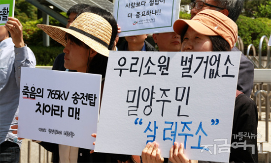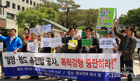 ▲ソウル市三成洞の韓国電力の前で密陽送電塔工事中断を要求する記者会見が開かれた。[出処:いまここ] 密陽送電塔工事の再開から二日目の5月21日、ソウル市三成洞韓国電力本社前で工事中断を要求する記者会見が開かれた。 核のない社会のための共同行動が主管した記者会見でキリスト教環境運動連帯 のヤン・ジェソン牧師は、「国民をしっかり保護しろと言った政権と警察が、 主人である国民に暴力を行使した」とし、韓電の工事強行と警察の公権力投入 を強く批判した。ヤン牧師は「そこは人と生命が生きる土地だ。工事を今すぐ 中断しろ」と話した。 緑の党共同運営委員長のハ・スンス弁護士は今朝、関電がツイッターで「昨日 入院した住民三人は皆退院した」、「住民の安全のために最善を尽している」 という内容に接したとし、確認した結果、住民1人は大きな病院に移動するため に待機中で、残り2人も病院にいると明らかにした。ハ弁護士は「韓電側になぜ 事実と違う内容を流すのかと抗議したら『確認できず、退院するものと思った』 という回答を受けた」として「怒りがこみ上げる」と話した。ハ弁護士は、 「公企業の韓電はこの数か月間、住民との対話を拒否し、世論を糊塗して真実 を隠している」と批判した。彼は「昨日病院に運ばれた方々は81歳、80歳、74 歳だ。工事を強行すれば昨年のイ・チウさんのような悲劇がまた起きるかもし れない」とし「今すぐ工事を中断しろ」と要求した。