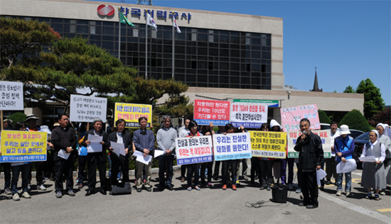 ▲密陽駕谷洞の韓国電力の前で天主教正義具現全国司祭団と送電塔反対対策委が記者会見を行った。[出処:天主教正義具現全国司祭団] ![]() 翻訳/文責:安田(ゆ)