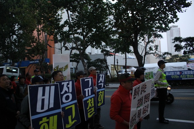 [出処:民主労総大邱本部] 10月22日午後8時30分頃、慶北大病院駐車管理解雇労働者と労組幹部3人は、 大邱市中区三徳洞にあるマンションの前に集まった。 9月30日、慶北大病院との契約が終了した後も駐車管理労働者たちに未払いの賃金約9千万ウォンと退職金約2億4千万ウォンを支払わない用役業者のセロムエスティ社長、 チョン某氏(72)に退職金支払いを要求するためだった。 彼らは同日午前にもチョン氏に退職金の支払いを要求したが、受けることができなかった。 チョン氏の所在地を確認し、退職金の支払いを要求するために民主労総関係者7人が集まった。 当時、現場にいた民主労総大邱本部のパク・ヒウン事務局長によれば、 社長の通報で午後9時20分頃に警察が出動した。 警察はマンションの前に座っている彼らを新型採証装備と動画カメラで撮影を始めた。 撮影の理由と所属を言えと抗議すると、その後、追加で警察人員が増員され、彼らを「公務執行妨害」だとして逮捕を試みた。 急な逮捕に民主労総の関係者が抗議し、この時に警察はテイザー・ガンを発射した。 民主労総関係者3人がテイザー・ガンに当たり、1人は逃げた。 テイザー・ガンに当たったある労働者は、警察が続けてテイザー・ガン四発を撃ったと主張した。