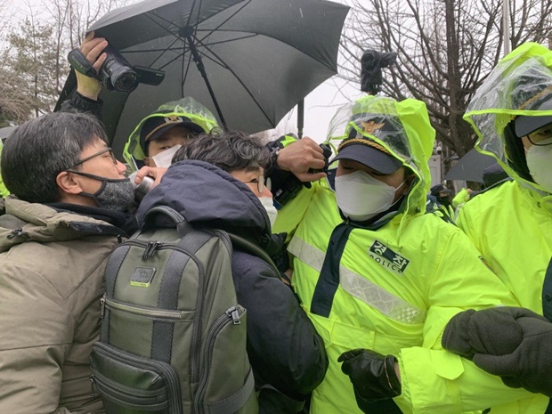 警察が青瓦台の近くで故ムン・ジュンウォン騎手座込場撤去糾弾記者会見を開こうとした参加者を妨害し、対峙が行われた。 遺族をはじめとする参加者約20人は記者会見が予定されていた午前11時から現在(午後2時30分)まで、 警察に対して記者会見を防ぐ理由を知らせてくれと抗議している。 ![]() 先立って故ムン・ジュンウォン騎手市民対策委(市民対策委)と ムン・ジュンウォン烈士民主労総対策委(烈士対策委)は、 2月28日午前11時に青瓦台噴水台前で記者会見を行い、 2月27日に発生した故ムン・ジュンウォン騎手追慕空間強制撤去事態に対する 政府の責任を問おうとした。 だが午前11時頃、警察約40人が記者会見場所へと移動している 遺族と参加者を孝子洞治安センターの前で阻止した。 ![]() 市民対策委と烈士対策委は午前11時40分頃、状況報告で 「強制撤去過程で多数の女性参加者が手足に怪我をするなど 暴力的なことが発生していた」とし 「この内容で記者会見を進めようとしたが、 場所に行くこと自体を防いでいる状況だ。 文在寅(ムン・ジェイン)政府と朴槿恵(パク・クネ)政権が唯一違うのは 青瓦台から100メートルのところで記者会見と集会ができるということだったが、 この二つの政権の権威的な態度には違いがない」と糾弾した。 彼らは記者会見文で 「(故ムン・ジュンウォン騎手追慕空間暴力撤去と人権侵害に関して) 何よりも文在寅政府の責任が一番大きい」とし 「中央政府が容認しなければ光化門の真中ではありえないことだった。 暴力的な撤去用役の行為を是正しろと、あちこち悲鳴と共に叫んだが、 警察は無視しただけでなく、むしろその暴力に協力した」と指摘した。 参加者は記者会見の後に108拝を行い、 青瓦台に抗議書簡を提出し、大統領との面談を要求する計画だった。 だが警察は記者会見の後に予定されていた108拝が 未申告集会に当たるとし、記者会見不可の立場を繰り返した。 市民対策委は12時頃に青瓦台に提出する予定だった抗議書簡で、政府に △去る27日のムン・ジュンウォン追慕空間暴力撤去と人権侵害に対し公式に謝罪すること、 △100日になる前に故ムン・ジュンウォン騎手の葬儀ができるようにすることなどを要求した。 続いて彼らは100日になる前に葬儀を行うためには、 国務総理室の傘下に真相調査委員会を構成し、 遺書で言及された責任者を処罰しなければならないという立場だ。 一方、鍾路区庁は2月27日午前7時50分頃、 警察12中隊および鍾路区建設管理課職員と用役300人を動員し、 故ムン・ジュンウォン騎手対策委座込場を強制撤去した。 この過程でムン・ジュンウォン烈士の夫人のオ・ウンジュ氏と 義理の父親のオ・ジュンシク氏を含む7人が負傷して救急車で運ばれ、 労働者4人が連行された。 市民対策委によれば警察は当時スクラムを組んでいた 女性参加者の下半身を引っ張り、下着がはだけるなどの性暴力も発生した。 市民対策委のパク・スンニョル共同代表は頭の負傷でしばらく気を失った。 現在、対策委状況室のテントは撤去され、 焼香所と霊柩車が残されている状態だ。 翻訳/文責:安田(ゆ)