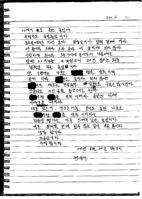 「○○刑事を信じた私がバカだった。助けてやるという言葉で、復職させてや るという言葉で、君だけは抜いてやる…家庭を助けたいという思いで、私が同 僚を売り飛ばしたひどい奴です。見たこともないものを見たと陳述したのです。 私の陳述書に3人の陳述は偽りの陳述です。」 「××先輩を説得して自白させろ。大砲を作ったと言っても拘束はしない。命 令した奴を捉えると言って、大砲を撃ったり、作るのを見たこともない私 に××を説得しろ...」-遺書より 8月20日に自殺を試みた双竜車座り込み労働者の遺書が公開された。金属労組と 双竜車支部は24日に記者会見を開き、警察の『強圧、過剰捜査』がすべての座 り込み組合員を対象に『組織的』に行われているとし、これを直ちに中断する ことを要求した。今回の事態の総責任者チョ・ヒョノ京畿警察庁長の解任など を要求した。 労組が公開したA氏の遺書には、警察の虚偽の自白強要と懐柔などの内容が含ま れている。特に労組は『復職の権限』がない警察が復職を口実に虚偽の自白を 強要しているとし、これは双竜車使用者側との協調の反証であり、虚偽自白を 受けてさらに多くの組合員を拘束し、労組を破壊する胸算用だと主張した。 現在A氏の容態は峠は越えたものの、まだ意識が戻らない状態で、集中治療室で 治療を受けている。
