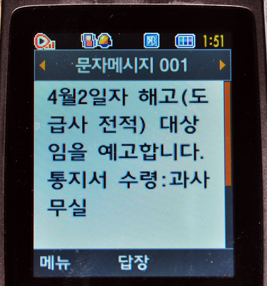 錦湖タイヤ使用者側が3月3日午後1時頃、組合員193人の整理解雇予告と1006人 のアウトソーシングによる請負化計画を労働庁に申告し、携帯メールと通知書 を該当組合員1199人に通知した。昨年8月の賃金団体協議の時に整理解雇申告書 を提出し、1週間後に該当組合員733人にショートメールで通知した前例に比べ て、今回は申告書提出後すぐ組合員通知を進めた。