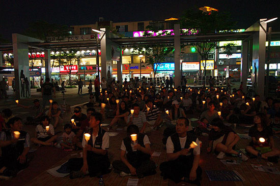 次は民衆歌手イ・スジン氏の公演だった。「これ以上隣人を、子供たちを、世 の中を、これ以上私たちをつらくするな」という歌詞がいつより双竜車の家族 の胸を打ったようだった。歌の公演の後は双竜車玉砕ストライキ当時、国家の 暴力蛮行の映像が上映された。当時のすさまじかった状況を映した映像は平沢 駅を通りかかる市民の足を捕まえた。 7月1日からは夜間屋外集会が認められた日なので、これを記念して全国各地で キャンドル集会が進められた。同時刻、ソウルの江南でキャンドル集会をした が、直接参加できない江南キャンドルの主導者は、組合員に頑張れという手紙 を送ってきた。闘争の具体的な理由は違っても、生存のため、もっと良い世の 中のためのキャンドルとキャンドルの出逢いは、文化祭の参加者の温もりとし て伝えられた。 この日のキャンドル集会は8月6日の玉砕ストライキ闘争を最後に組合員が肩を 組んで泣き叫んだ「共に行こう、私たちのこの道を」を共に歌い、午後9時過ぎ に終わった。2次キャンドル文化祭は8月15日(木)午後7時に平沢駅前で行われる 予定だ。(メディア忠清=記事提携) 翻訳/文責:安田(ゆ)