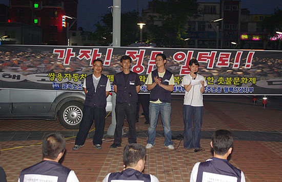 ちょうど1年ぶりに平沢駅で双竜自動車労働者のキャンドルがまた灯った。7月 1日午後7時から、平沢駅では双竜自動車拙速売却反対と解雇者復職のための キャンドル文化祭「行こう! なつかしい職場へ」が開かれた。 文化祭が始まる1時間前から市民にアイスコーヒーを配るキャンドル喫茶店と、 双竜車闘争を伝える宣伝戦、組合員への嘆願書署名が進められた。お父さんと 一緒に出てきた子供も加った宣伝戦と署名戦は市民から多くの呼応を受けた。 双竜自動車解雇者で、民主労総平沢安城支部事務次長のコ・ドンミン氏の司会 で進められたこの日の文化祭は、平沢、昌原、整備の双竜車組合員と家族、地 域の連帯組織など100人を越える人々が参加した。