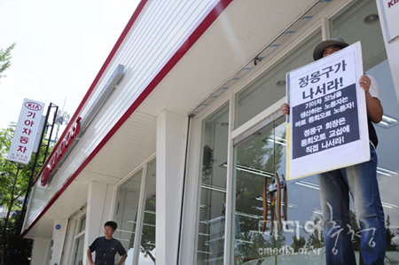 労働、市民社会団体、進歩政党、政治組織などが所属する非正規職ない世の中 作りネットワークが8月19日、全国の起亜自動車販売店前で現代起亜車使用者側 が金属労組ドンヒオート社内下請支会と直接交渉をするよう要求する1人デモを した。