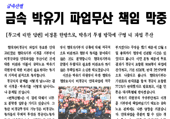 『週刊変革産別』が25日間工場占拠ストライキで非正規職闘争の新しい神話を 書いた蔚山現代車非正規職闘争をめぐる現代車正規職労組の責任論に続き金属 労組のパク・ユギ委員長の責任論を強く提起した。変革産別はまた、現代車 非正規職支会の2次ストライキの時期を法院判決時点を中心に分析して不法派遣 高等法院判決が宣告される2月を目標に2次ストライキを準備しようと提案した。