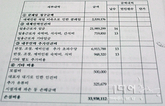 ▲ポグァン産業損害賠償請求細部内訳の一部. また、会社の代表者の夜間手当てなども請求したが、業者はこれについて、 『人材投入と非熟練工の指導および工場占拠防止などにより退勤できなかった』 とし『これによる人件費と、運行が普段より増加したことによる燃料費の追加 金額も被告が弁償すべき金額』とした。 『賠償責任』の名目で、支会の幹部ではなく組合員全員に損害賠償を請求した 理由を明らかにした。業者は支会の幹部が損害賠償責任を負うのは勿論だが、 組合員が『不法ストライキ』を知ってもストライキを続けたことで損害が発生 したので、『不真正連帯責任』を負うのは妥当だと主張した。 不法ストライキ? 文字通り主張だけ業者が組合員に損害賠償を請求したのは、現代車非正規職のストライキを 『不法ストライキ』と決めつけるためだ。 彼らは現代車元請が非正規職に損害賠償を請求したのと同じ論理を展開した。 『非正規職の正規職化』は、労働庁、労働委員会の救済手続きか司法的手続き により解決すべき『権利紛争』の事項で、争議行為の対象にならず、業者との 団体交渉を取り消して、現代車元請に相手にストライキをしたということだ。 また、大法院の判決を『任意に拡張解釈して主張』したと解釈した。 しかしセイル法律院側は、「今回のストライキは労組が主導し、規定の 手続きをすべて経た全般的に合法的なストライキだ」と主張した。 また「労組が主導して調整前置および賛否投票を行い、牙山工場の争議行為は 全般的にほぼ単純な労務提供拒否の水準だ。特に、会社が請求した期間が11月 30日までだが、その期間に注目できる占拠などがあったとは言えない。また、 該当期間あるいはその後に不法な要素があったとしても、それは一時的なもの で、それによりストライキ全体が不法ストライキになるわけではない。だから 無条件に不法ストライキだと主張するのは、文字通り主張でしかない」 と明らかにした。 また、現代車の元請使用者性を否定する業者側の態度に厳しい忠告を与えた。 セイル法律院は、「派遣法により使用者は現代車であり、これを確認する訴訟、 勤労者地位確認訴訟が提起された。訴訟の結果が出るまでは下請業者の勤労者 の地位にあるのではない。無条件に判決が出るまでは使用者が下請業者だという 主張は合わない」と一蹴した。 労組幹部以外にも、組合員にまで『賠償責任』があるとして損害賠償を請求し たことには「一般組合員は損害賠償の責任を負わない」と主張した。大法院の 判例(2006. 9. 22. 宣告2005タ30610判決)は「一般組合員に争議行為の正当性 をいちいち判断することを要求するのは、勤労者の団結権を害しかねない点、 争議行為の正当性に疑いがあっても一般組合員が労働組合および労働組合幹部 の指示に応じず、勤労提供を続けることは期待しにくい点などに照らしてみれ ば、一般組合員が不法争議行為で労働組合などの指示により単純に労務を停止 したことだけでは労働組合または組合幹部と共に共同不法行為責任を負うとは いえない」とした。 名ばかり社長が使用者?現代車元請と業者は告訴告発、損害賠償請求を強行しているが、現代車で蔓延 する非正規職問題に法院が判決したが、大企業の社会的責務には一言半句もない。 元請の指示で非正規職が働いているから業者が『名ばかり社長』と判断されたが、 さらに判決を待とうとか、現代車は元請でないとか、会社は大法院の判決を 否定することに汲々としている。また、元請ではないという理由で4か月間、 一度も交渉に出てこなかった会社は、むしろ交渉をしようと言ってストライキ をしたことを理由に、非正規職に責任を転嫁している。 大法院の判決だけでなく、牙山工場非正規職7人が勤労者地位確認訴訟で勝訴、 11月12日高裁で現代車の鄭夢九会長が『本当の使用者』だという趣旨の判決が あったが、会社側は『法律的な名分』がないと主張している。 非正規職労働者たちは、『名ばかり社長』が組合員に損害賠償を請求するのも 理解できず、代替人材の投入による費用請求も批判した。非正規職は代替人材 の投入は、『ストライキ無力化』の行動だとし、不良の発生、非熟練労働者の 安全問題などを提起していた。 社内下請支会は「使用者側は不法代替人材が組合員より費用がかかると主張し、 損害賠償を請求した。その上、アルバイトの宿泊費、間食費にまで損害賠償を 請求するずうずうしさと稚拙さを見せた。使用者側は恐怖感を感じさせて 労組の組織力を潰そうとしている」と伝えた。(記事提携=メディア忠清) 翻訳/文責:安田(ゆ)