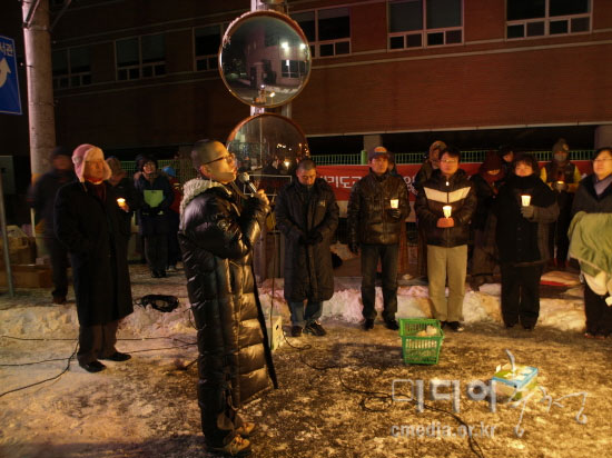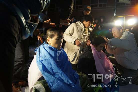 12月28日午後5時、京畿道教育庁の前で京畿道公立幼稚園臨時講師と、京畿教育 運動連帯『より合わす』等の市民社会団体が集まり『臨時講師雇用安定争奪の ための決意大会』を開いた。当日降った多くの雪と寒い天候にもかかわらず、 100人ほどが参加した。 臨時講師キム・ヒョンジョン代表が削髪式を進めると、集会の雰囲気は最高潮 に達した。削髪式を終えた臨時講師のキム・ヒョンジョン代表は、「非正規職 教師の身分でも、子供たちへの気持ちまで非正規職にはならない。不当な待遇 を一人で我慢せずに闘うのは教師の良心であり、子供たちに堂々としていたい と思うこと」と闘争の理由を明らかにした。 ![]() ![]() 全教組のチョン・ヨンテ組合員は「京畿道教育を正すために今回の全教組選挙 に候補に立った。臨時講師の屈することのない闘争に連帯することこそ京畿道 の教育を正す第一歩だ」とし、共に髪を刈った。 全国不安定労働撤廃連帯のキム・ヘジン代表は「人間らしく生きる方法を教え ることが教育だ。日常茶飯事のように自分がした約束を破る京畿道教育庁は、 教育への信頼を破っている。人権と平等を実現し、誤りを正す臨時講師の闘争 こそ正しい教育を実現するもの」と闘争を支持した。 労働戦線のチョ・フェジュ代表は「本当に進歩的に非正規職問題を解決してい るのか、進歩教育委員長のキム・サンゴン教育委員長に問いたい。京畿道のす べての単位が連帯して力強く闘争しよう」と話した。 起亜自動車華城工場のシン・ソンウォン政策局長は「私が起亜自動車でテント を張った日も零下15度になった日だった。その時のことをよく思い出す。すべ ての非正規職労働者の心は一つだ。仲間たちと同じ気持ちで一緒にする」とし 闘争物品としてラーメンの箱を伝えた。 集会を終えた後、京畿道教育運動連帯「より合わす」の主催で京畿道教育庁前 で「臨時講師闘争勝利」を祈る忘年会を開いた。 ![]() ![]() 京畿道公立幼稚園臨時講師は京畿道教育庁が約束した雇用安定に合意するまで 無期限テント座り込みに突入した。 一方、翌日の午前10時に道教育庁は臨時講師の要求を受け入れ、交渉を再開す る。臨時講師側によれば『道教育庁は今後、臨時講師と誠実な交渉を行い、2月 に合意した内容に基づき、問題を解決する』と述べた。京畿道教育庁と公立 幼稚園臨時講師の間で6年にわたる長い意見の対立が、問題解決の結実を結べ るのかが注目される。(記事提携=メディア忠清) 翻訳/文責:安田(ゆ)