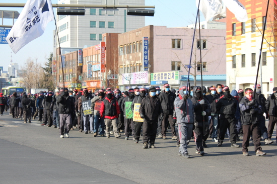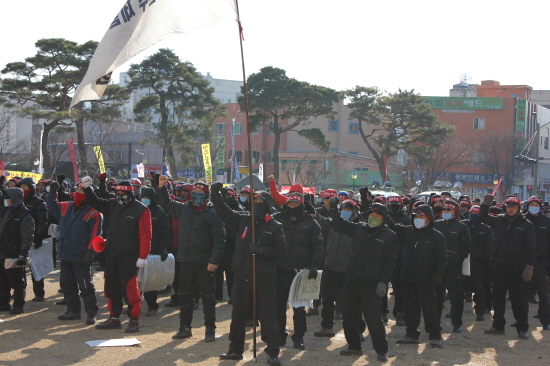 [出処:チャムソリ カン・ムンシク記者] バス労働者約500人は予定通りなら交渉が開かれていたはずの2時、市庁に集まっ て決意大会を開いた後、韓国銀行交差点までデモ行進をした。デモ行進を終え た後、交渉決裂の知らせを聞いた組合員たちは残念そうに市と使用者側の不誠 実な態度を声を合わせて批判した。