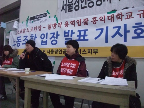 弘益大非正規職労働者の全員解雇事態が別の局面に入る展望だ。 弘益大清掃、警備、施設労働者たちは、15日間の座り込みを続けて学校に雇用 の継承と労組の認定を要求しているが、学校当局は労組幹部の告訴告発と一方 的な用役業者選定を進め、弘益大分会座り込みに対応している。こうした学校 側の対応に、公共労組ソウル京畿支部は1月17日午前、弘益大本館で記者会見を 行って労組側の立場と今後の闘争計画を発表した。 ![]() 用役入札説明会、相変らず『雇用継承』は拒否弘益大学校は1月12日、新用役業者選定の入札説明会を開催した。だが説明会で はこれまで弘益大分会が要求してきた組合員の全員継承要求と賃上げ案は含ま れず、結局学校側は分会の対話と要求事項不認定をさらに強める形になった。 説明会資料によれば、学校側は清掃人員は「用役遂行経験から適正人員を算定 し、入札申込書に提示し、用役契約を誠実に遂行する」とし「必ず現場の実態 調査を行い、適正人員を決めなければならない」と提示した。だから労組側が 要求してきた組合員170人の全員雇用継承は、新しく落札した用役業者の役割に なった。 問題は、学校側が基準人員と金額を提示しない状態なので、結局最低落札制で 用役業者を選ぶという既存の方針を固守していることだ。最低落札制が適用さ れると、用役側は人員削減と低い賃金策定を避けにくくなる。 これについて公共労組ソウル京畿支部のパク・ミョンソク支部長は、「たとえ 最低賃金を守ると言っても、用役会社に恣意的な適正人員の判断をさせること で、低価格、ダンピング入札を誘導しようとしている」とし「それだけでなく 選定の過程も不透明で、構成された業者選定委員を公開せず、疑問だらけの 業者選定を進めている」と批判した。 実際に学校当局は、雇用継承問題について法的基礎がない状況で強制するのは 難しいという立場を固守し続けている。ソウル京畿支部ある関係者は「13日、 野五党の関係者が副総長との面談で雇用継承を要求した時も、副総長は法的に 雇用継承は強制できないという立場を表明し続けた」と説明した。 延大、誠信女子大など多数の大学が『雇用継承』を明示こうした学校側の立場についてパク・ミョンソク支部長は「学校がオウムのよ うに雇用継承の強制は難しいと話すのは、明らかに本質を歪める行為」と釘を さした。すでに延世大、誠信女子大、清州大、釜山大などでは、労働者の雇用 継承を保障する合意書が存在するためだ。 元請のチュソン大学校は2007年の用役業者入札公告当時、働いている清掃労働 者10人の保障勤務を提示した。延世大学校も用役業者との契約条件で「既存の 清掃員を継承する」と明記した。 労組が元請の学校側との合意書で雇用を保証させた事例もあった。清掃労働者 集団解雇事態で苦労した誠信女子大は、2008年に公共労組と「大学は清掃用役 業者変更時は、用役業者に所属する勤労者の雇用が維持できるように努力する」 という合意書と雇用保障協約書に署名した。清州大と釜山大、蔚山科学大学も 労組との雇用維持合意書に同意した。 そのため弘益大学校分会は、雇用継承、賃上げなどについての学校側の強硬な 立場が、結局、事態を解決する意志がないことを示すと反発している。彼らは 記者会見文で「弘益大の態度は、他校の雇用継承合意書などの態度と正反対」 とし「対話と妥協で、いくらでも学校当局と労働者が互いに勝者になる道があ るのに、『とにかく労組はだめだ』という理解できない態度を取っている」と 批判した。 労組幹部と組合員6人を告訴告発...「本格的な労組破壊」また学校側は入札説明会前日の1月11日、労組幹部5人とイ・スッキ分会長など 6人に告訴告発措置を取ったという。彼らが麻浦警察署に提出した告訴告発理由 書では、業務妨害と建造物侵入、総長監禁などだ。こうした学校側の告訴告発 措置に労組側は、「学校が労組を瓦解させる長期的な戦いを誘導している」と 反発している。 イ・スッキ弘大分会長は「これから学校と用役業者は、組合員個人への圧力を 加え、組合を分散させる作業に入るだろう」とし「だからこの戦いで何よりも 重要なことは、分散せずさらに一つに固まること」と説明した。続いて彼は 「今までが体当たりだったとすれば、今からわれわれは頭脳戦をしなければな らない」と強調した。 パク・ミョンソク支部長も「学校は告訴告発という強力な対応で、もう一つの 問題を作った」とし「労組も、座込場にROTC学生を動員して査察と監視をした 学区団長の職権乱用に対して法律チームで調査をしており、調査が終り次第、 告訴告発措置を取る」と明らかにした。 一方、ソウル京畿支部のクォン・テフン組織部長は「学校側は1月19日に、用役 業者側から申請書を受け付ける計画で、業者選定の結果は24日あたりに出てく るだろう」と伝えた。これに対応し、公共労組ソウル京畿支部は申請受付日の 19日午後2時、ソウル