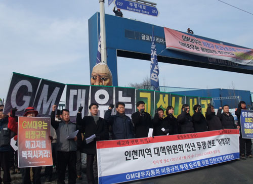 GM大宇車非正規職解雇労働者15人の全員復職のために『GM大宇車非正規職闘争 勝利のための仁川地域対策委員会(対策委)が集団ハンストに突入した。 対策委は1月24日午後、大宇自動車工場正門前で記者会見を行い、「50日以上、 仁川地域の全力量を動員して、非正規職労働者の闘争に連帯してきた対策委は、 本当にこれが最後という気持ちで無期限ハンストに突入する」と明らかにした。