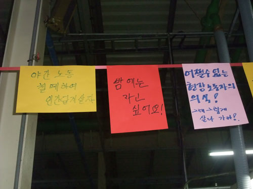 この2年間、ユソン企業牙山工場で5人の労働者が命を失った。交通事故で死亡 した一人の労働者を除けば、突然死や自殺などによる死亡だった。 そのため労組は現在施行されている夜昼2交代制と日給制が、労働者をストレス と疾病、そして死亡に至らせると主張している。2009年、労使が『昼間連続 二交代制』と『月給制』を2011年1月から施行すると合意したのもこのためだ。 だが昨年12月から11回開かれた労使交渉で、使用者側は一回も提案を出さず、 結局18日に労組がストライキを始め、使用者側は職場閉鎖し、一週間の占拠座 り込みをすることになった。結局、ユソン企業労使は『昼間連続二交代制』と 『月給制』という労働者の健康権をめぐり対立している局面だ。 2年間、牙山工場で自殺、突然死などで4人が死亡ユソン企業牙山工場のホン・ジョンイン労安部長は「2009年から現在まで牙山 工場で死亡した労働者は五人」とし「1人は夜間労働に投入されてまもなく急性 敗血症で死亡し、更衣室で脳出血で死亡した人、また昼夜間の業務ストレスで 臓器に異常が生じて死亡したり、自殺を選択した人もいる」と明らかにした。 残る1人は交通事故で死亡した。ヨンドン工場でも1人の労働者が出退勤バスで の退勤中、突然死する事件が発生することもした。 ![]() 死亡という極端な状況を除いても、労働者たちは各種の業務上の疾病に苦しん でいた。ホン・ジョンイン部長は「非労災の公傷処理まで入れると、少なくと も一日に3件程度の事故が発生している」と説明した。反復的な作業による筋骨 格系疾患から火傷、薬品による皮膚のトラブルと目に飛ぶ事故などが現場で発 生しているという。 特にホン・ジョンイン部長は「睡眠を充分に取れず、生活リズムがこわれれば 正常な業務を100%遂行できず、これにより突然死や災害の確率が高まる」とし 「特に深夜労働で身体が不安定な状態で夜昼、有害物質を反復的に吸入するこ とで健康を害したりもする」と説明した。結局、正常な昼間勤務で災害を予防 しなければならないという主張だ。 実際に夜間労働が身体に悪影響を与える事実は公然たる事実だ。国際ガン研究 所では、夜間労働そのものを2級発ガン物質として扱っており、夜間労働をする と寿命が13年縮まるという研究結果も提示されている。 ユソン企業のヨンドン工場で14年間働いているパク・チャングン(仮名)氏は 「一週間、夜間は10時間、昼間は10時間働き、隔週で1か月に第二日曜に10時間 の夜間特別勤務をしている」とし「私のように昼夜間勤務をする労働者のほと んどは睡眠障害になり、私は高血圧の薬を欠かさず飲んでいる」と説明した。 またパク氏は「そうして夜間の仕事を終えて家に帰ると精神がもうろうとして 体調が良くないが、そうして働いても手に残るのは税金を引いて年4500万ウォン 程度」と糾弾した。 『日給制』、超過労働と強制労働を誘発![]() 現在ユソン企業で施行されている2交代制は、昼夜間8時間隔週勤務が基本だ。 だが基本給は月給の47.7%に過ぎず、残業特別勤務は労働者に必須の労働に なっている。パク・チャングン氏は「ほとんど100%が一日10時間2交代勤務を しており、もし基本給だけだと14年目の私の月給は168万ウォン程度」と説明した。 昼間連続二交代制が施行されると、6時30分から昼間勤務が始まり、夜間業務は 12時には終わる。昼夜間にわたる2時間の残業をなくし、一日8時間勤務が可能 になるのだ。 特に労組は昼間連続二交代制の施行により月給制を導入することを主張してい る。現在、ユソン企業で施行されている日給制は、時間給賃金制の変形された 形で、勤労時間による賃金保障と時間成果給制賃金形式を骨格にしている。 だが基本給は月給の47.7%に過ぎず、超過給与(時間外手当て、深夜手当て)が月 平均給与の19.7%を占める状況で、昼間連続二交代制が導入されると、日給制は 賃金削減につながる。そればかりか、現在の日給制は労働者に超過労働と労働 意欲を強制するという問題も内包している。 労組は「日給制は勤労時間により賃金を保障するので、労働者の勤労意欲を強 制し、超過労働を誘っている」とし「特に賃金計算が複雑になり、労働者たち は自分の賃金が正確にいくらなのか、どう算出されるのか分からない」と説明 した。 翻訳/文責:安田(ゆ)