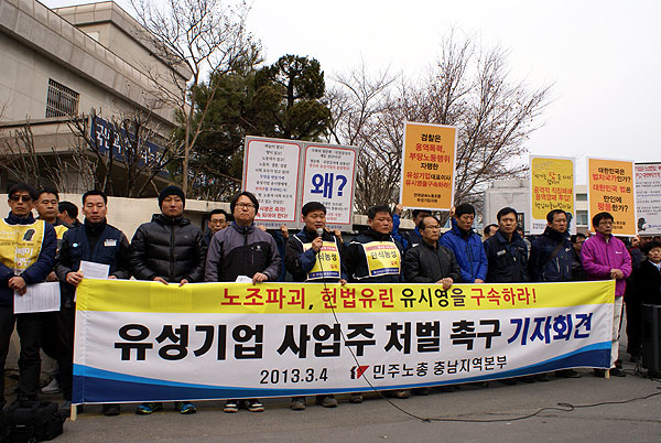 チェ・マンジョン民主労総忠南本部長、パク・チャンシク全国金属労組忠南支部長が3月4日、大田地方検察庁天安支庁でユソン企業事業主の拘束捜査と厳重処罰を要求する無期限ハンストに突入した。 昨年9月、国会聴聞会で創造コンサルティングが介入した「労組破壊」の真実が 暴露されてから5か月ほどが過ぎ、ユソン企業事態が起きてから2年近く経つが、 責任者の処罰が行われていないからだ。 ユソン企業の労働者たちは、労使合意事項の昼間連続2交代制施行を要求して 2011年5月に闘争に突入した。ユソン企業事態以後、労働者17人が拘束されて、 2人の労働者がまだ監獄にいるが、使用者側の関係者は誰一人処罰されていない。 特に、ユソン企業事業主への検察の捜査が遅れていて、労働者たちは検察には 捜査の意志がないとし、強く批判してきた。「労使間の公平性を失った事業主 への甘い捜査」だという。検察は1月に捜査結果を発表せず、補強捜査を指示し ている。 民主労総忠南本部と忠南北地域市民社会団体は同日午前、記者会見を行って 「ユソン企業で起きた暴力と不当労働行為は世間によく知られているが、実状 用役チンピラを雇って創造コンサルティングを通じ、暴力と労組破壊行為を主 導したユソン企業の経営陣への処罰は今まで全くなかった」と明らかにした。