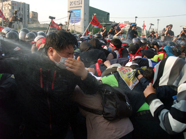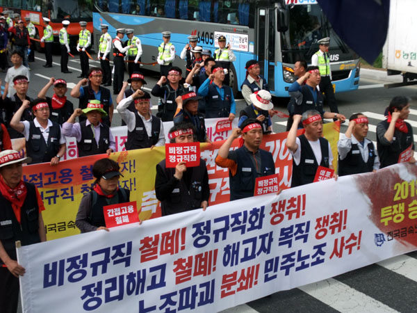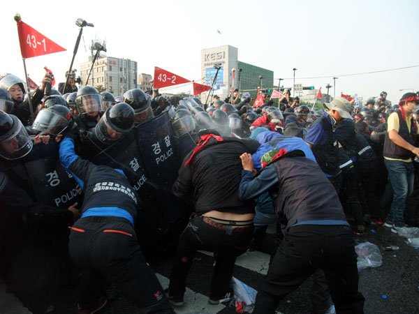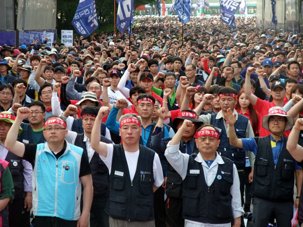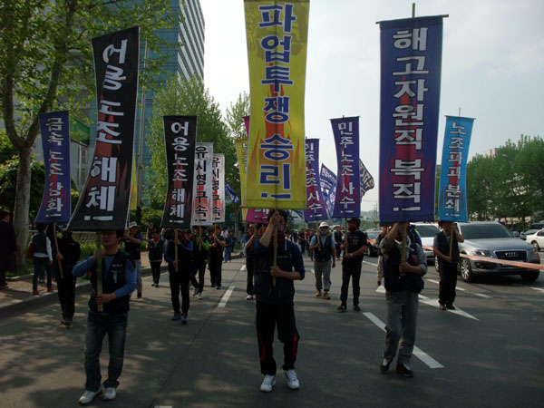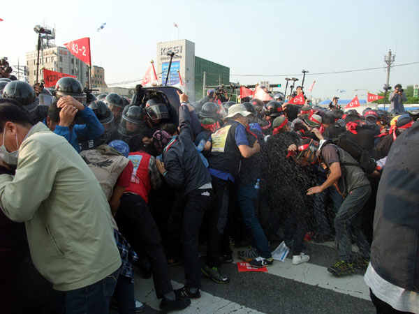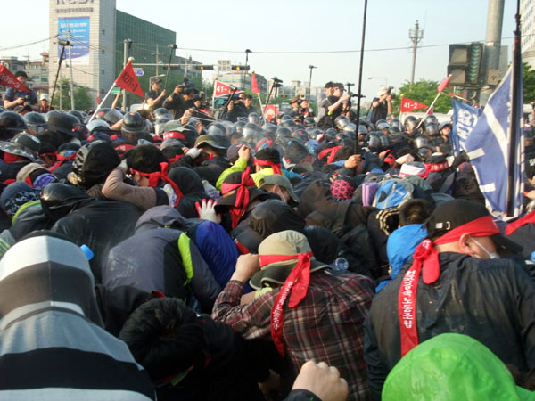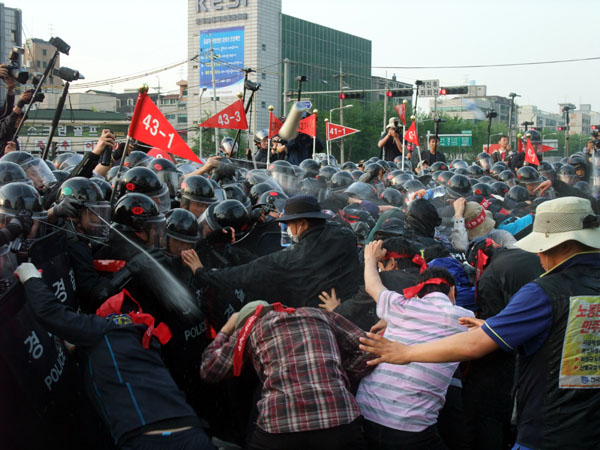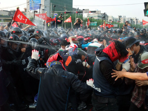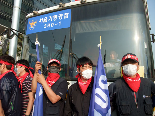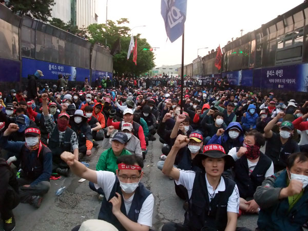 良才洞の現代起亜車本社前で再び非正規職労働者と警察の衝突が発生し、現代車非正規職支会組合員16人が連行された。 ![]() 現代車蔚山、牙山、全州非正規職3支会は5月15日、ストライキに突入した後、 「非正規職の正規職化」を要求して良才洞の現代起亜車本社前上京闘争を行った。 この日、金属労組も拡大幹部ストライキに突入し、良才洞本社前で全国金属労働者 決意大会を開いた。 約3千人の集会参加者は良才市民の森の前に集まり、午後4時から良才洞現代・ 起亜車本社前へとデモ行進を続けた。だが本社前の歩道と車道の一部が車壁と 警察兵力で封鎖され、デモ隊は現代・起亜車本社前の交差点で警察と衝突した。 この過程で現代車非正規職支会組合員2人が警察に連行された。 その後、金属労組は準備された集会を開くために本社前の道路に移動した。だが 現代車非正規職支会組合員が連行された組合員の釈放を要求し、警察バスを取り 囲んで、再び衝突が起きた。この過程でも多くの組合員が連行され、1人は負傷 して、病院に運ばれた。 ![]() ![]() その後、現代車非正規職3支会は決意大会場所の裏手に集まり集会を開いた後、 連行者の釈放を要求して警察と衝突した。警察はデモ隊に催涙液を散布して 対抗し、合計16人の組合員を連行した。 金属労組決意大会の参加者は6時20分頃に集会を終えて解散したが、非正規職の 組合員たちは連行者釈放を要求して衝突が続いた。ソン・ソンフン現代車牙山 非正規職支会長は「連行された仲間たちを救出し、鄭夢九(チョン・モング)の 拘束と不法派遣粉砕を勝ち取る」と声を高めた。パク・ヒョンジェ現代車蔚山 非正規職支会長も「3支会が残り、必ず連行された仲間を釈放させる」と明らかにした。 ![]() ![]() その後、現代車非正規職3支会は、現代車本社前の道路で略式集会を開いた後、 組合員が移送された警察署に移動した。蔚山非正規職支会は中浪署、牙山非正 規職支会は恩坪署、全州非正規職支会は金川署へと各々移動した。 現代車本社前で25日間、野宿座り込みを続けている現代車非正規職解雇者は、 当初は15日まで座り込みを続ける予定だったが、問題解決が遅れたことで 座り込み期間を延長する計画だ。 ![]() ![]() 一方この日、同じ空間で2つの集会と衝突が起き、議論が発生している。非正規 職組合員たちは連行者釈放を要求して場所の裏手で集会を開き、警察と衝突し て、金属労組側は準備された決意大会イベントを続けた。非正規職組合員が 警察と衝突する過程で、決意大会を終えた集会隊伍が帰り、堪え難い状況が演出 された。 以後、現代車非正規職3支会支会長はパク・サンチョル金属労組委員長をはじめ 金属労組幹部に抗議の意を伝えた。支会側は「連行者が発生したのに、彼らを 放置してどうして集会を解散できるのか」と反発した。金属労組側は「準備し た集会を中断することはできない」と明らかにした。 ![]() ![]() ![]() ![]() 翻訳/文責:安田(ゆ)
